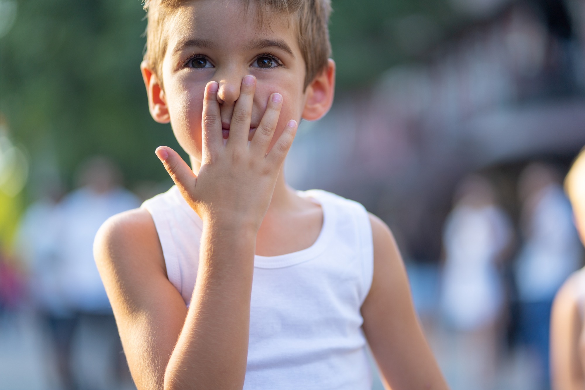 real life portrait shot cute 5 years old boy outdoors in summer shallow focus background blurred